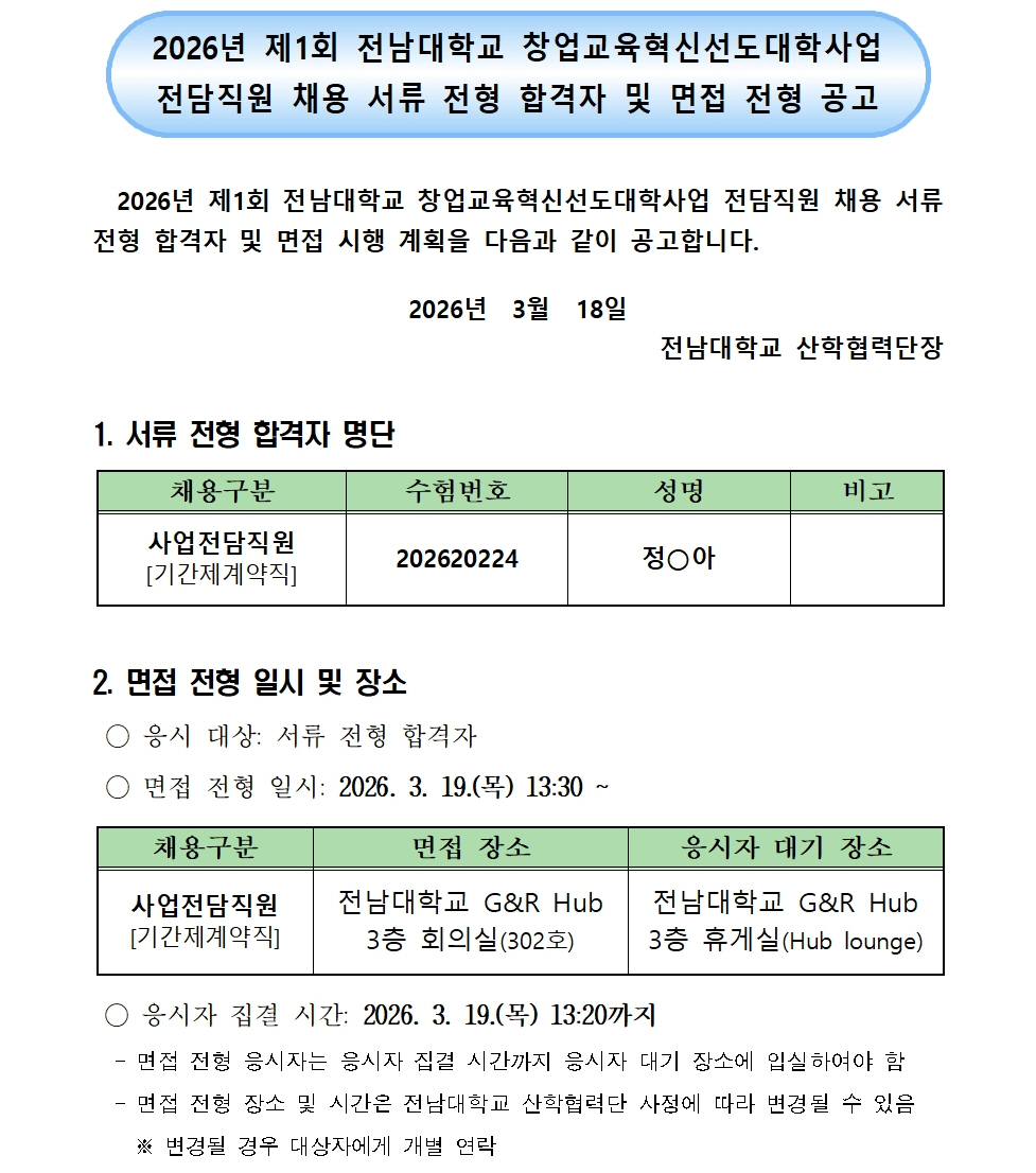 2026년 제1회 전남대학교 창업교육혁신선도대학사업 전담직원 채용 서류전형 합격자 및 면접 전형 공고
